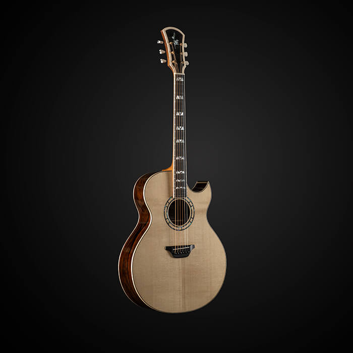 After having built so many Jumbo flattops, it was time to reconsider the acoustic design of a new Jumbo model. The voicing of the top is completely new, as well as that of the back, while still keeping a traditional X-bracing pattern to produce a traditional yet unique sound.