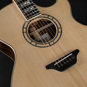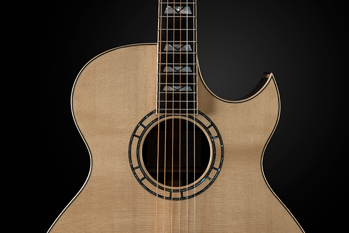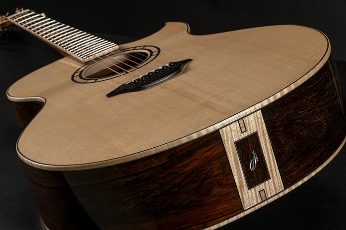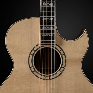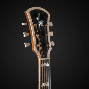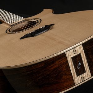 After having built so many Jumbo flattops, it was time to reconsider the acoustic design of a new Jumbo model. The voicing of the top is completely new, as well as that of the back, while still keeping a traditional X-bracing pattern to produce a traditional yet unique sound.